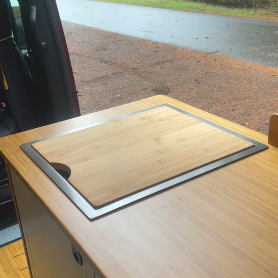 A hidden camper sink is a space-saving vanlife sink where the faucet tucks away inside the basin and is covered by a flush lid. This design gives you extra counter space in your camper van while keeping your kitchen area sleek and functional.