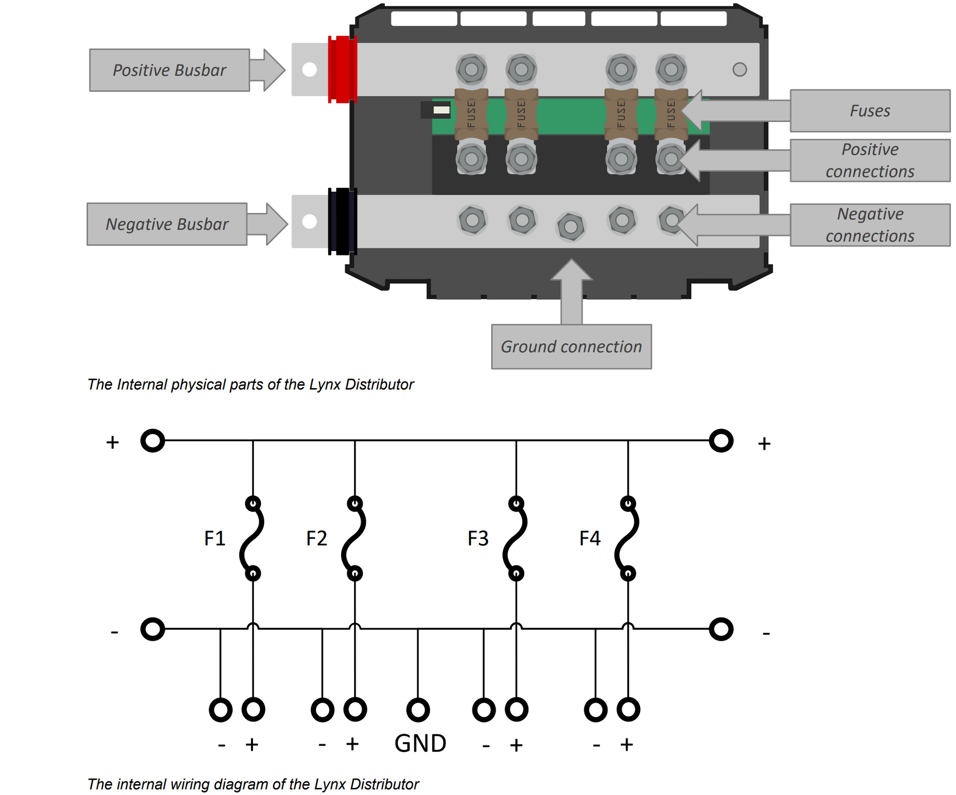 A modular DC busbar, with locations for four DC fuses. It will monitor the status of each fuse, and indicate its condition with a LED on the front. Part of the modular Lynx distribution system.