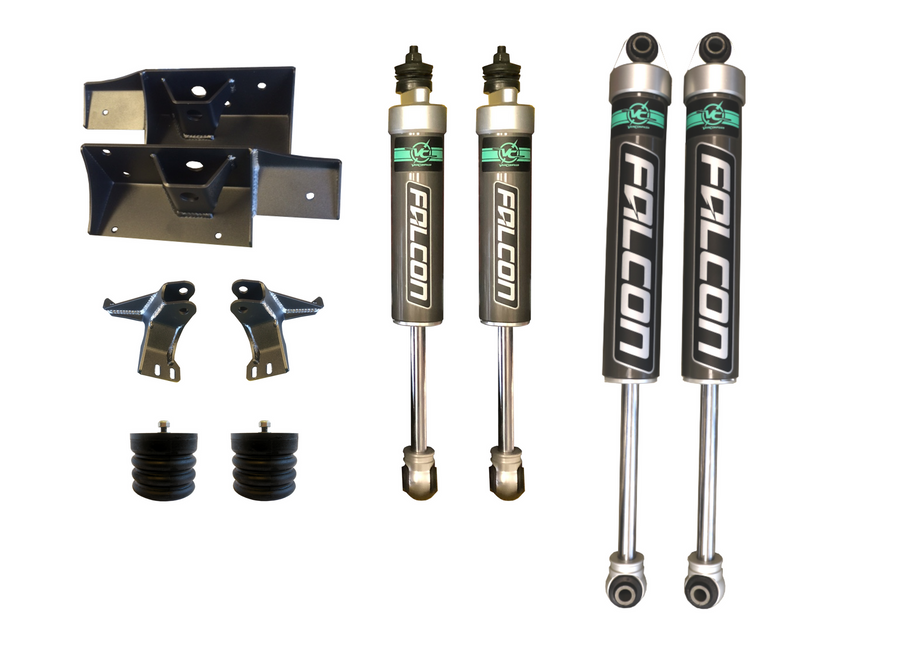 4x4 Sprinters are very capable and versatile vehicles, however many Sprinters have stiff factory struts, that make riding over small bumps uneven and extreme swaying on uneven ruts. Van Compass has developed our Stage 3 system specifically for motorhomes, heavily built camper vans and loaded work vans. Our custom tuned Falcon 2.1 Monotube shocks smoothes out the harshness experienced on washboard roads and sharp, abrupt impacts. The bounce experienced over large bumps is reduced and the side to side sway from crosswinds and uneven surfaces is minimized. Our rear mini spring pack restores ride height and suspension wheel travel for a great ride, without adding unnecessary harshness due to their more progressive design. Each set of Falcon shocks are specifically tuned per application based on weight and a set of front sumo springs increases front spring rate, further helping with sway stability and harsh bottoming out.