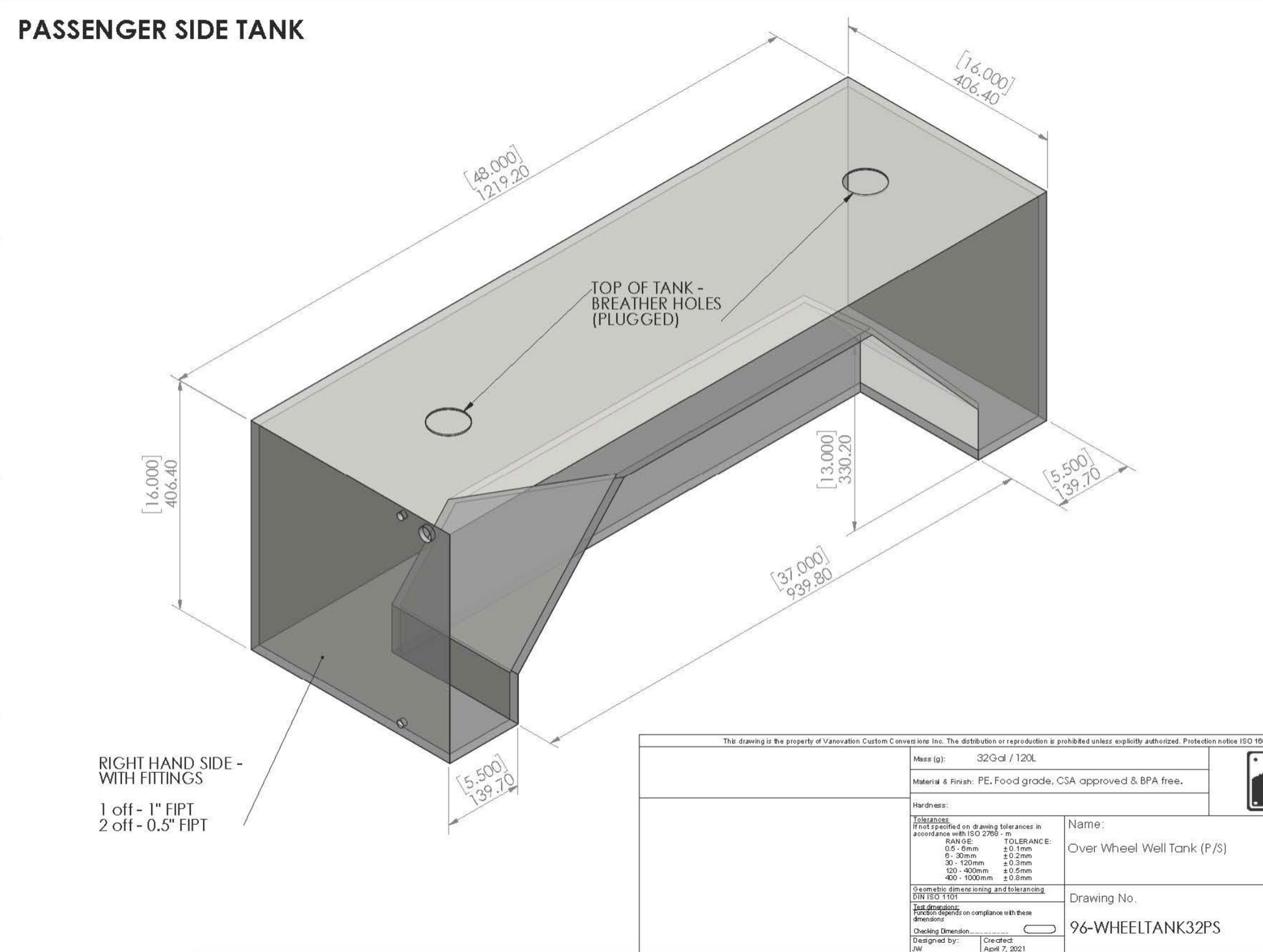 32Gal / 120L Wheel Well Fresh Water Tank